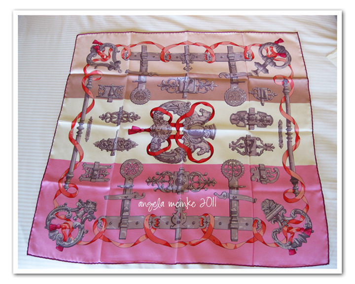 We then asked about the 70cm classic scarf called 'Ferronerie', I have been longing for this scarf ever since the first time I saw it - high on my list of 'must have H scarves' (yes still a couple more to collect). It had been released for 2011 in a beautiful pink colourway with orange highlights, delicious! Given the few they release of these I doubted they would have it, or that I would get my hands on one!