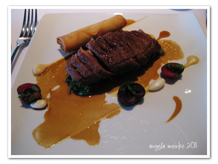 | Peter with his main course - roasted breast of duck with cherries, green almonds and a star anise and ginger sauce |