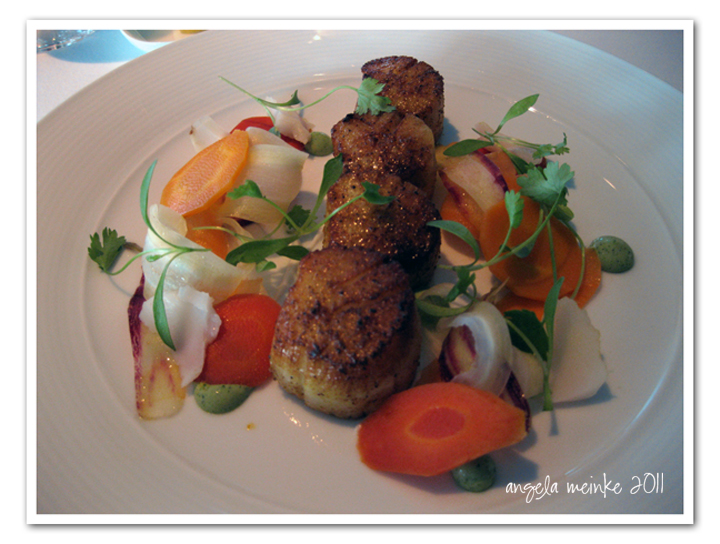 For entrée I had the Scallops (who can ever go past scallops?) spiced and roasted with a salad of heirloom carrots, young coconut and a coriander and yoghurt dressing.