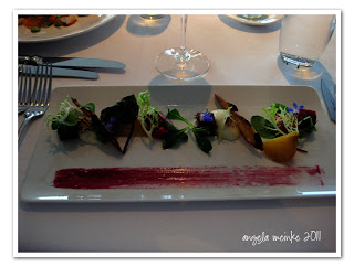 Peter enjoyed the salad of baked golden beetroot with goat's cheese, walnuts, beetroot mousse and baby chard leaves.